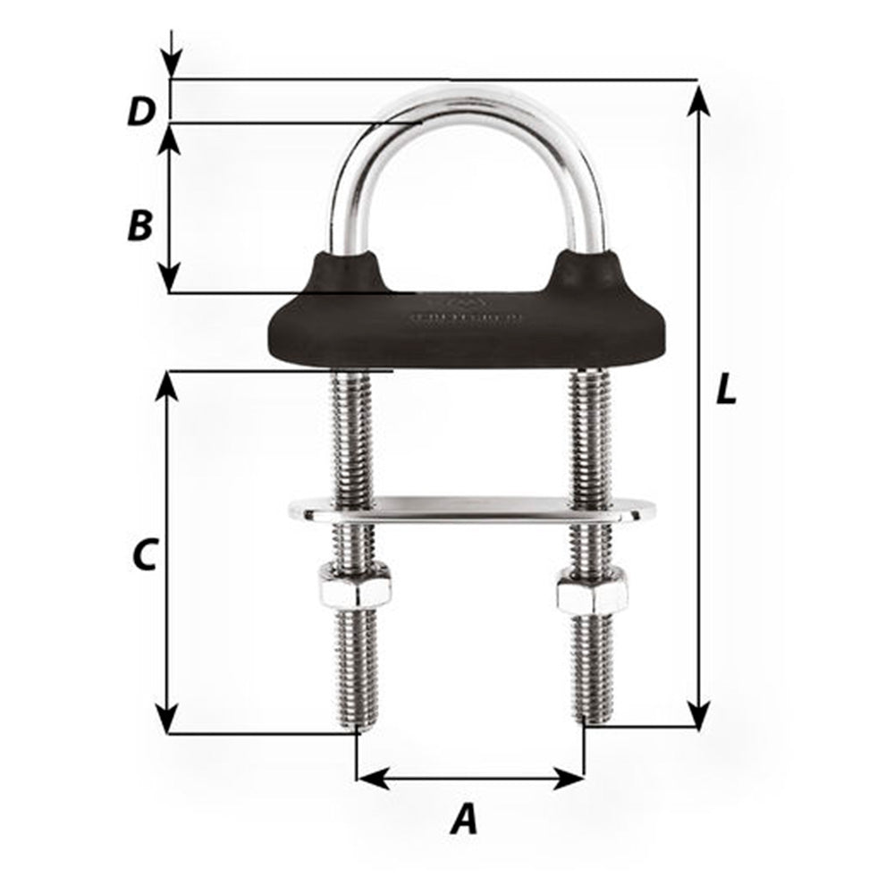 Fully drop-forged product with high-quality stainless steel. Outstanding working and breaking loads. Complete water tightness thanks to the resistant rubber collar (black color). Easy installation (no need to use a waterproof sealant). For any kind of fastening applications (shrouds, lifeline, blocks...). Delivered with bolts and counter plate. Max tightening torque: 4,5 Nm.