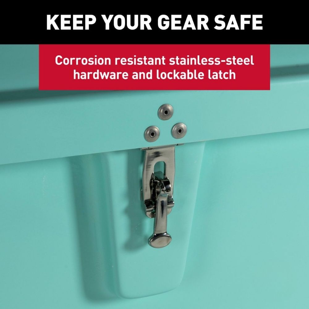 - KEEP YOUR GEAR SAFE-The stainless-steel lockable latch offers peace of mind knowing that your marine accessories are safely stored on your dock or patio. The stainless-steel hardware is corrosion-resistant and heavy-duty.