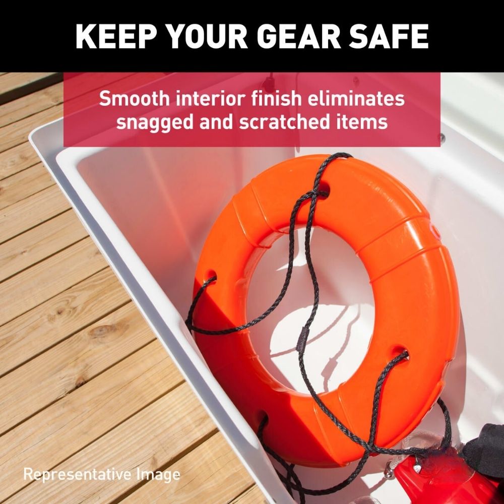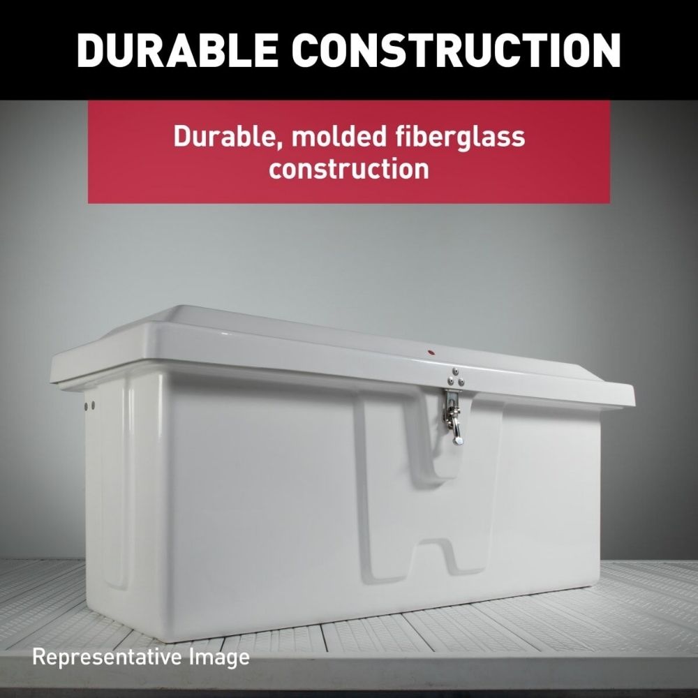 • DURABLE CONSTRUCTION- The molded fiberglass design holds up in all types of marine environments, while the heavy-duty stainless steel lockable latch and hinges are corrosion-resistant, keeping your gear safe and protected for the long haul.