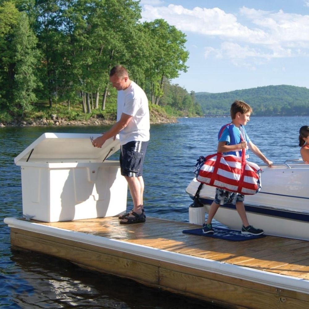 - EASY ACCESS - Our deck box is a breeze to open and securely close with the built-in gas lift shocks, especially helpful with an armful of gear. These gas shocks, standard in all Taylor Made dock boxes, keep the lid open, even in high-wind areas and unstable docks.