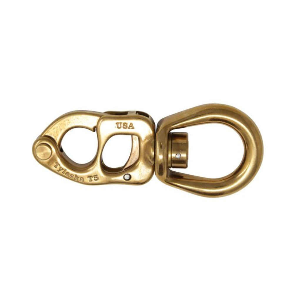The Tylaska TY1008-L-BRZ is a T8 Large Bail Snap Shackle with a bronze finish. This shackle is ideal for high-load applications where a large bail and a classic aesthetic are desired. The bronze finish is renowned for its excellent resistance to saltwater corrosion, making it a dependable choice for marine use. With its large bail, this genuine Tylaska shackle is easy to handle and provides a secure connection for larger lines or multiple attachments.