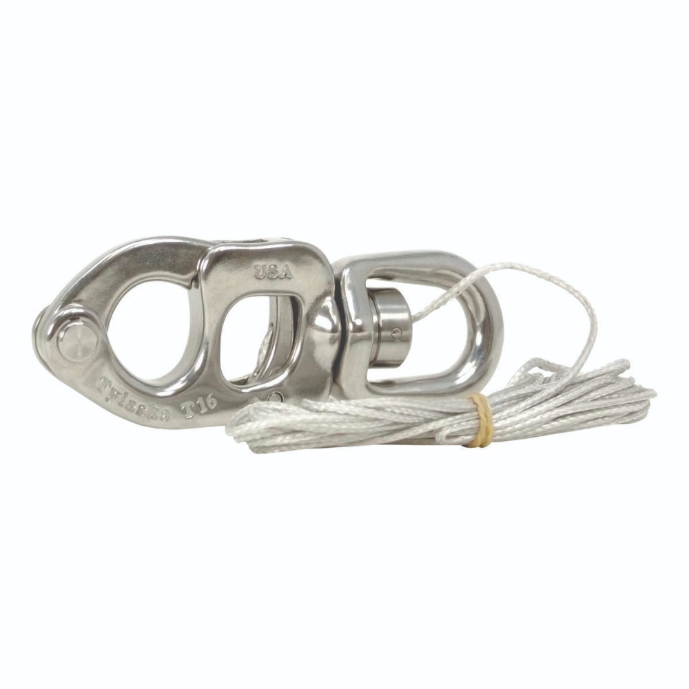 The Tylaska TY1016-L-MB is a T16 Large Bail Snap Shackle equipped with a Marten Breaker. This high-strength shackle is designed for extreme load applications and features a Marten Breaker, which allows for quick release even under significant tension. The large bail is perfect for heavy-duty lines or multiple connections. This genuine Tylaska shackle is the ultimate quick-release solution for situations where both maximum strength and the ability to release under load are paramount.