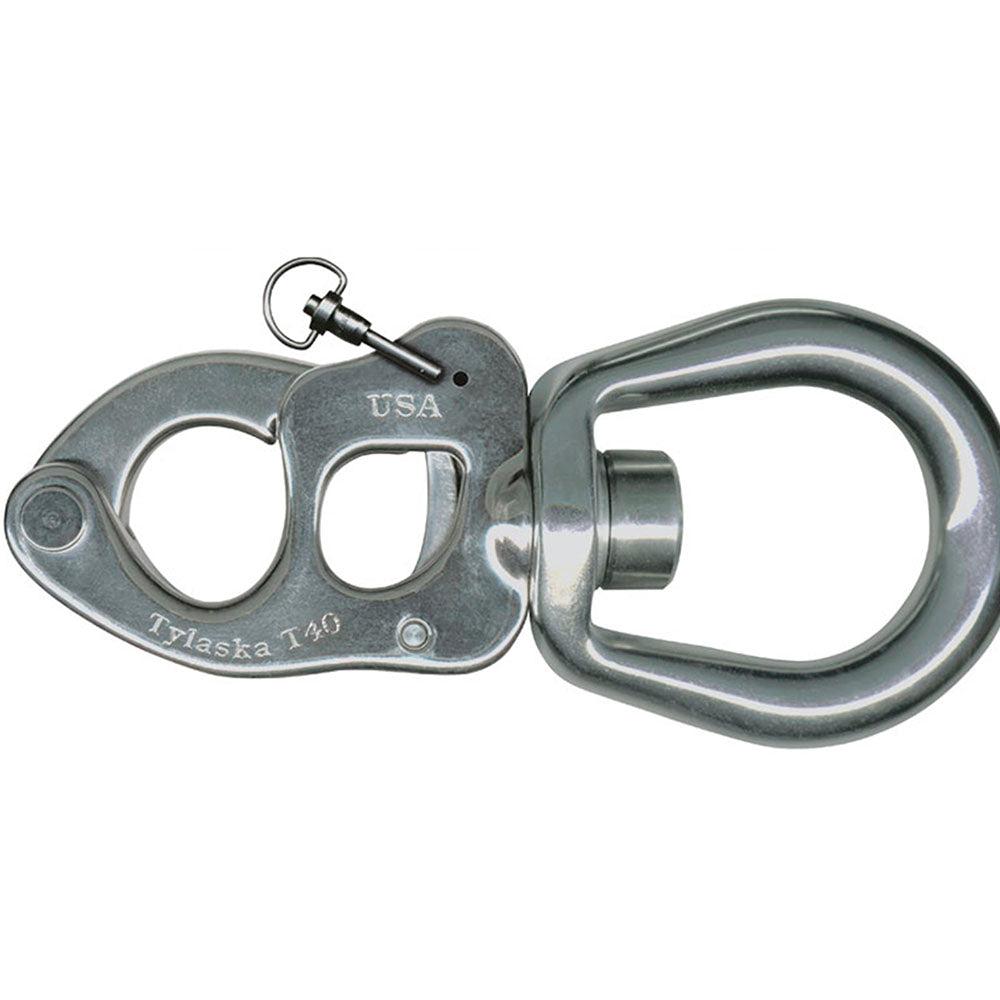 Tylaska T40 Snap Shackles are designed for massive sailboats or for towing applications. With a breaking strength of 40,000 pounds, this shackle can handle sail loads on the largest of sailboats. A lanyard can be attached to a hole in the end of the trigger allowing for remote release; an ideal configuration for towing applications. The included locking pin provides extra security from accidental release. The T40 is intended for static load applications only and is NOT approved for lifting applications.