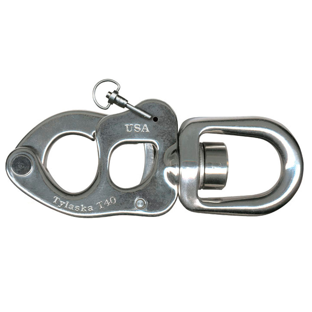 Tylaska T40 Snap Shackles are designed for massive sailboats or for towing applications. With a breaking strength of 40,000 pounds, this shackle can handle sail loads on the largest of sailboats. A lanyard can be attached to a hole in the end of the trigger allowing for remote release; an ideal configuration for towing applications. The included locking pin provides extra security from accidental release. The T40 is intended for static load applications only and is NOT approved for lifting applications.
