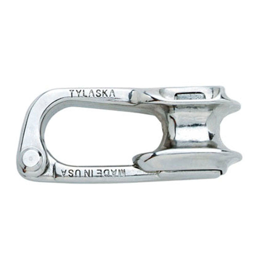 As an alternative to Tylaska´s J-Lock style shackle, the press lock serves the same purpose with a different design. Two opposing triggers are pressed to open the shackle. Both opposing triggers must be pressed at the same time to open the shackle, which safeguards against accidental opening during flogging. Their opposing trigger mechanism is ideal for sheets and other applications requiring a fitting small enough to pass through the lead cars to make re-leading a sheet easier. They are also used for halyards, outhauls and lead changers.