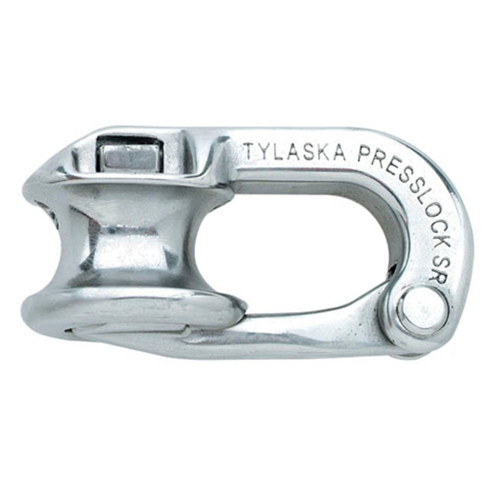 As an alternative to Tylaska's J-Lock style shackle, the press lock serves the same purpose with a different design. Two opposing triggers are pressed to open the shackle. Both opposing triggers must be pressed at the same time to open the shackle, which safeguards against accidental opening during flogging. Their opposing trigger mechanism is ideal for sheets and other applications requiring a fitting small enough to pass through the lead cars to make re-leading a sheet easier. They are also used for halyards, outhauls and lead changers.