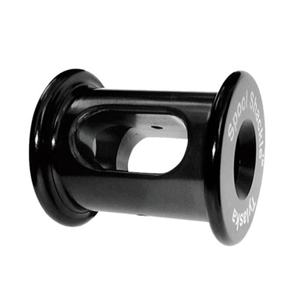 The Tylaska S20 Spool Shackle is crafted from premium materials like high-strength aluminum and high-impact polycarbonate, ensuring robust performance. It is compatible with various lines, requiring only a looped end, whether it's pre-spliced or simply knotted. The shackle is engineered for both conventional and hi-tech sailing lines, and features a retaining pin and an optional "O" ring for added stability.